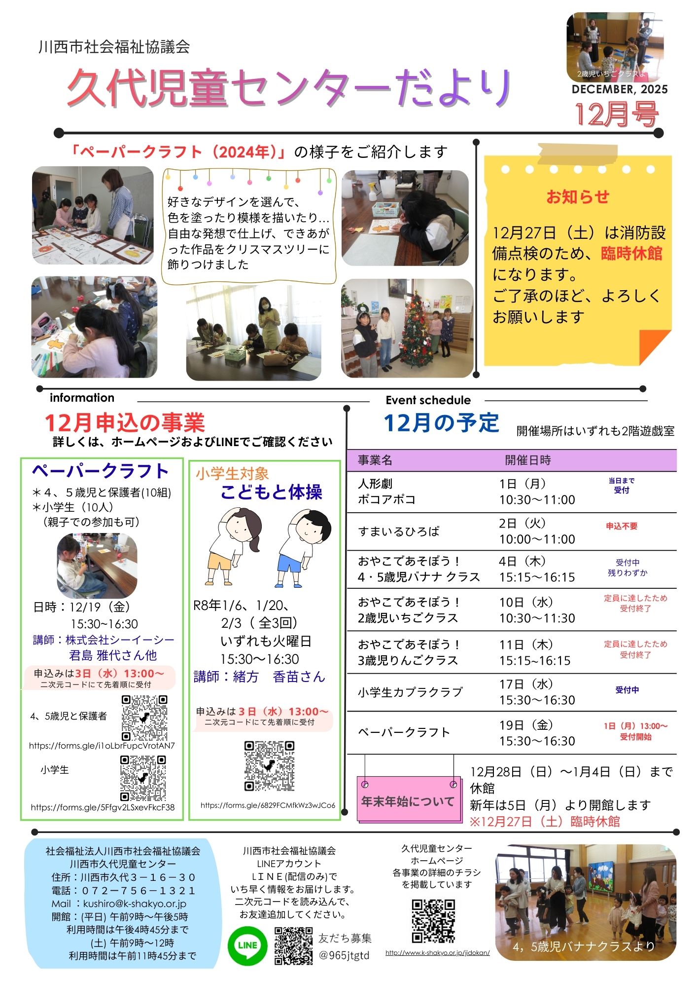 平素は、川西市久代児童センターをご利用頂きありがとうございます。