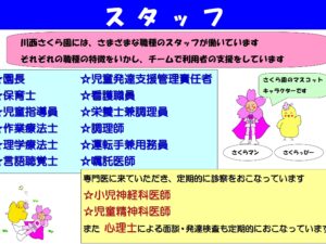 管理者、児童発達支援管理責任者、保育士、児童指導員、看護職員、事務員