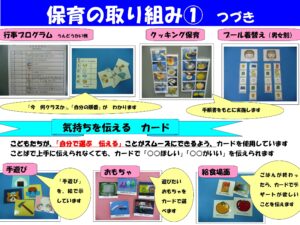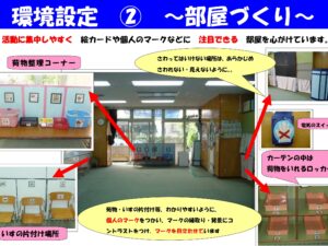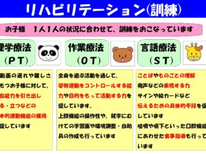 月1回程度、保護者の方を対象に、サポートブックの作成、言語聴覚士・作業療法士・理学療法士・児童精神科医師等の講習、OBの保護者との交流等を行っています。