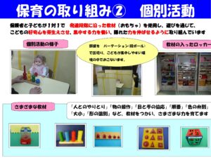 専門的な知識・技術を持つ訪問支援員が、保育所(園)、幼稚園、認定こども園などに訪問し、お子さんが集団活動の場で生活しやすくなるように直接お子さんに支援します。また、生活場面の中で、お子さんに対する関わりの工夫や配慮点を保護者や担当の先生にお伝えします。